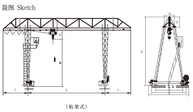 MHh型電動葫蘆門式起重機(jī),整機(jī)與CD1型或MD1型電動葫蘆配套使用,適合于露天作業(yè)的固定跨間,本機(jī)禁止吊運(yùn)易燃易爆品,根據(jù)用戶要求還可以制成單端外伸懸臂式或無懸臂式結(jié)構(gòu)。起重量為1-32T,跨度為7.5-35.5米,工作級別為A3,工作環(huán)境溫度為-25℃--40℃。