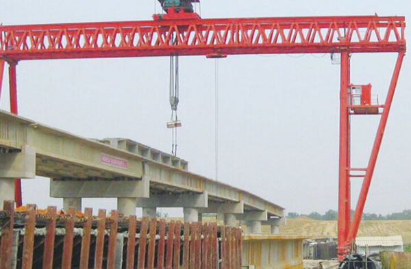提梁機(jī)的功能:提梁機(jī)既可兩臺配合抬吊預(yù)制梁,也可以單臺起重機(jī)配雙吊具起吊預(yù)制梁,兩臺同時起重的提梁機(jī)各自的起重量一般為 450 噸,單臺起重的提 梁機(jī)起重量通常可達(dá) 900 噸。它配置支腿行走、天車行走及天車起吊設(shè)備,可以實現(xiàn)機(jī)械化動作。主要用于將預(yù)制梁從制梁臺提吊至存梁臺位,預(yù)制梁養(yǎng)護(hù) 完成后將其從存梁臺位吊運到運梁車上。作為起重設(shè)備完成架橋機(jī)的組裝和拆卸。還用于架設(shè)墩身不高的旱橋。